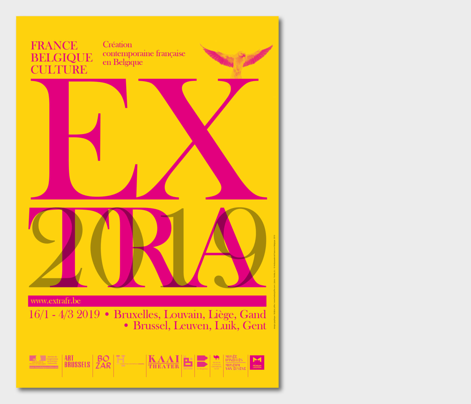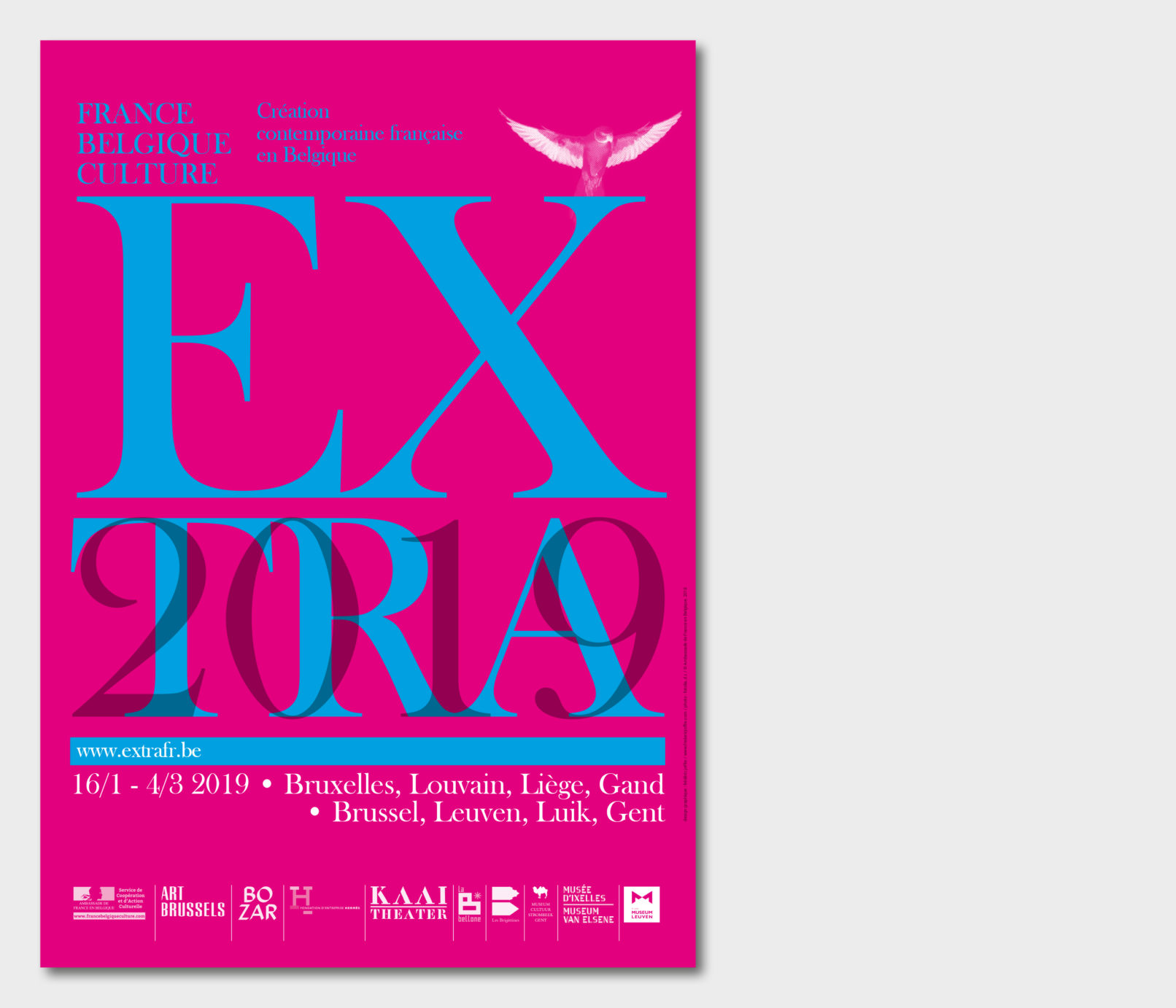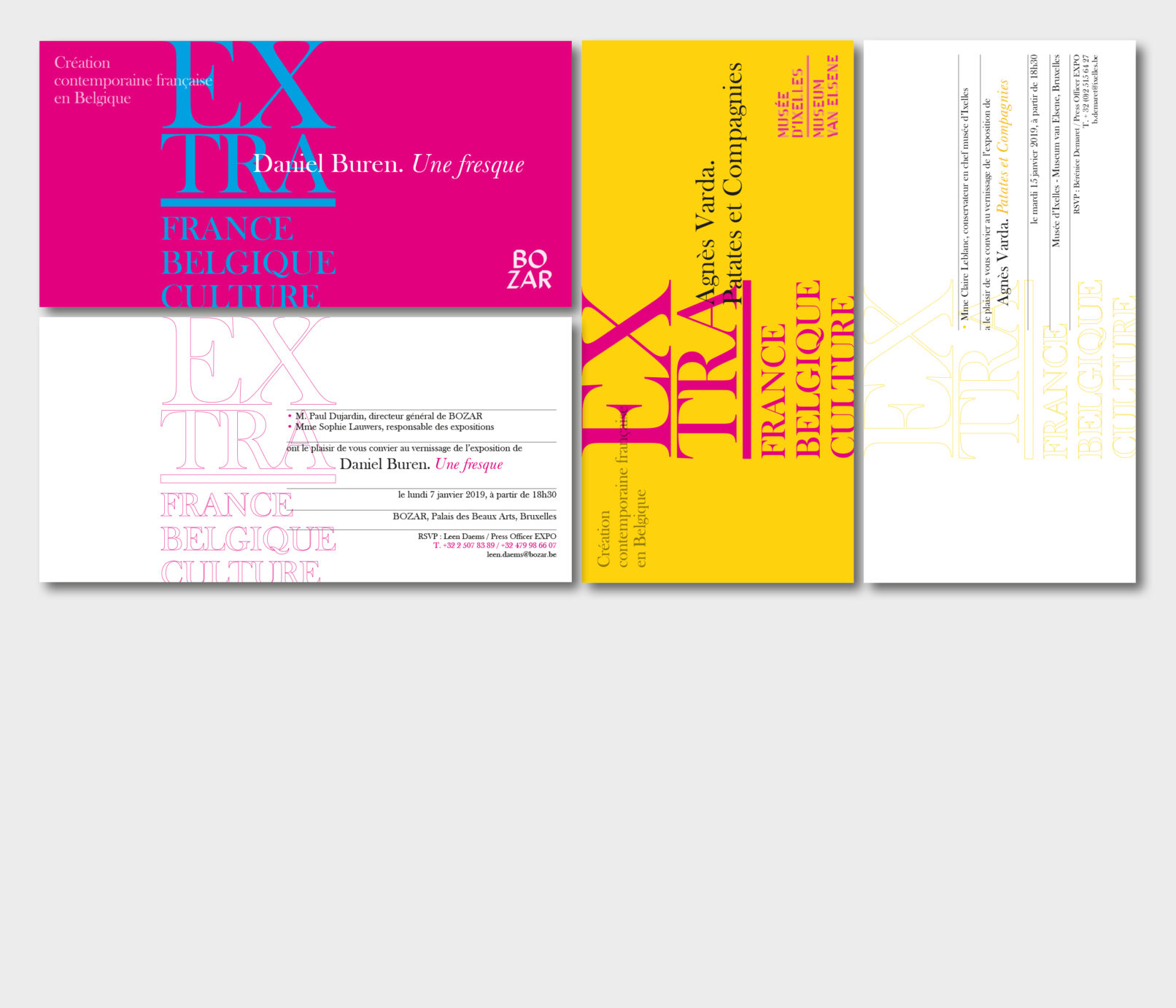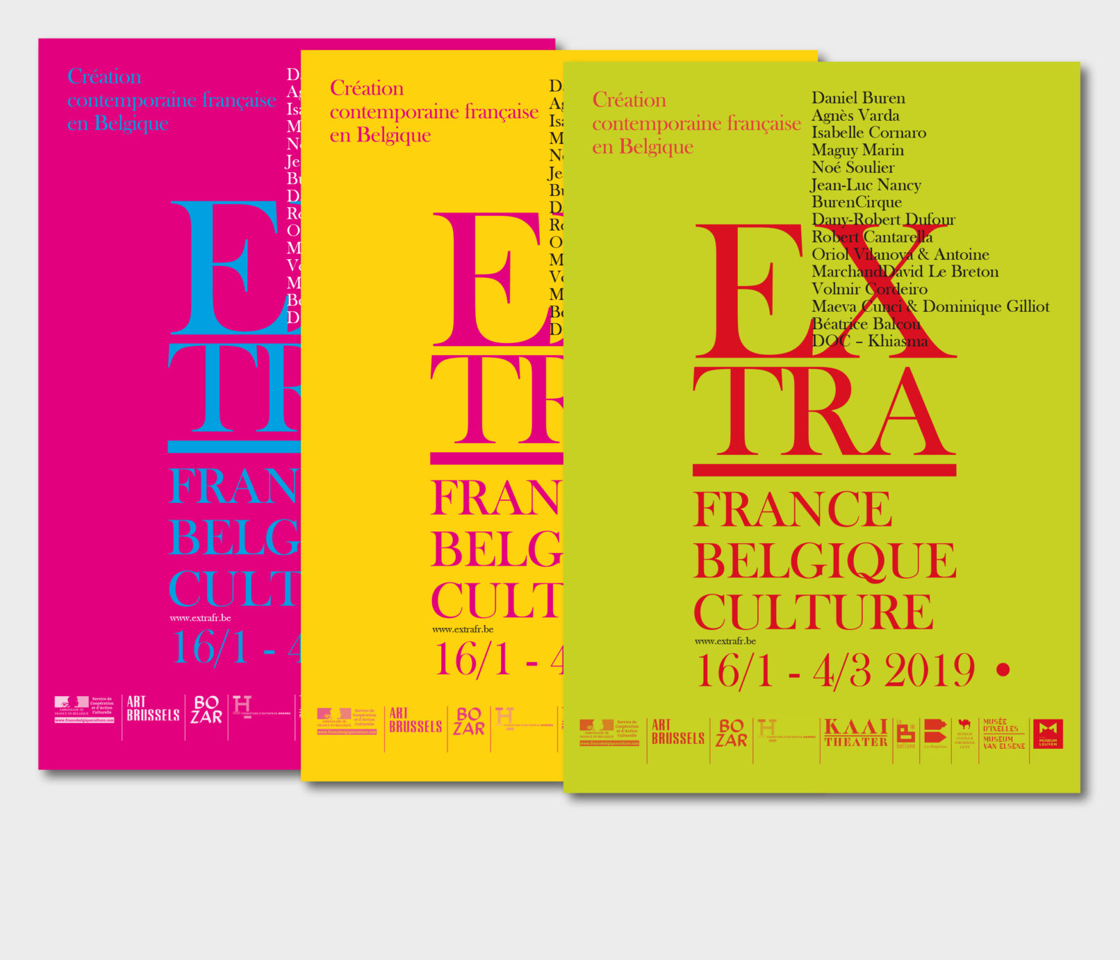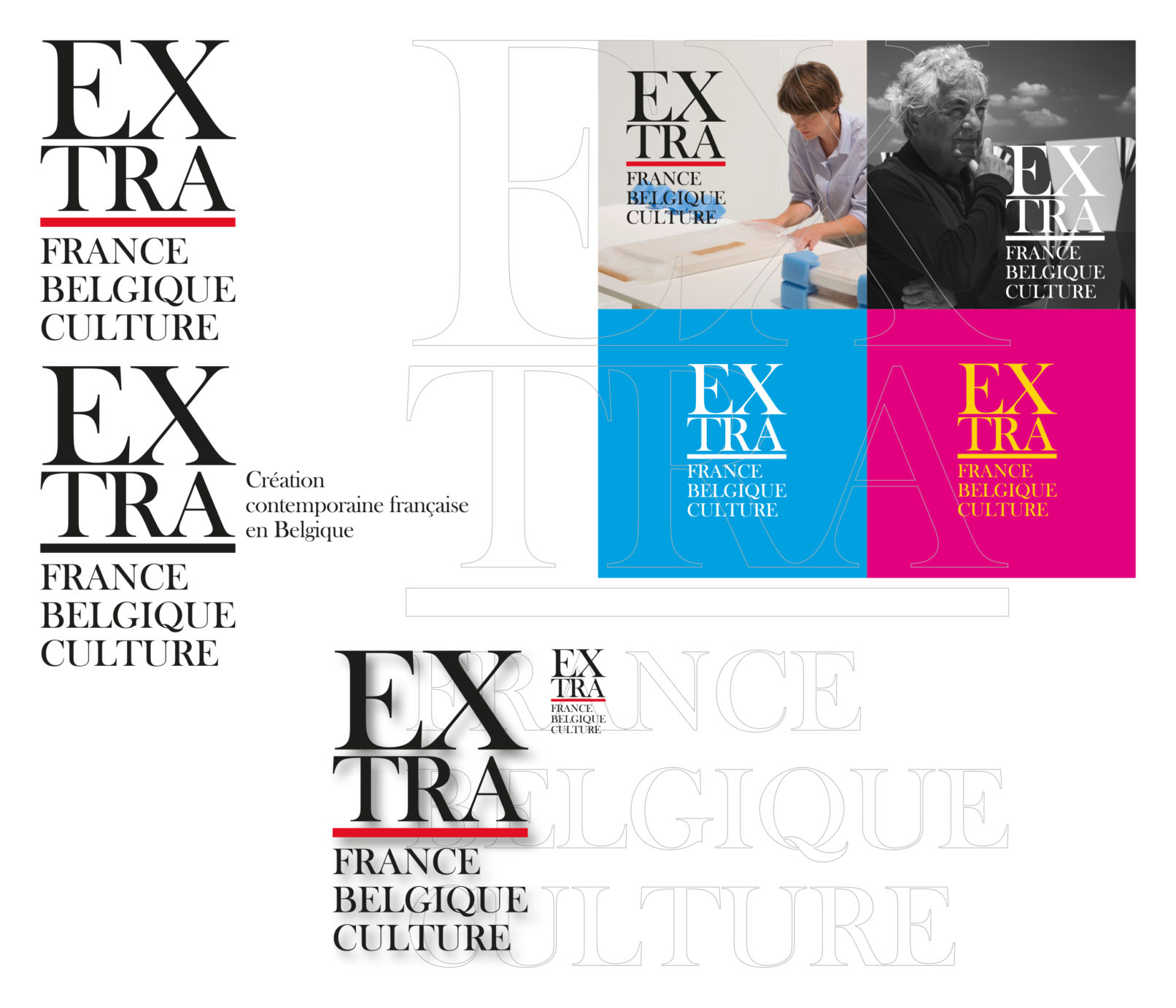 Créé par le service culturel de l’Ambassade de France en Belgique le label Extra réunit 12 structures culturelles belges pour mettre en valeur et faire découvrir les différentes facettes de la création contemporaine française dans le domaine des arts visuels, de la performance et du spectacle vivant. Sollicité par le service culturel pour rafraichir la ligne graphique du label, j’ai opté pour la création d’un logotype volontairement typographié, dans la mesure où la diversité des artistes, des disciplines (danse, architecture, concerts, conférence, théâtre, performance…) interdit, de mon point de vue, l’utilisation d’une image en particulier. Le logotype typographié est décliné sur tous les supports, dans une palette de couleurs vives, volontairement saturées pour donner l’impact nécessaire à cette promotion de la création contemporaine française en Belgique. Projet malheureusement refusé par l’Ambassade de France.