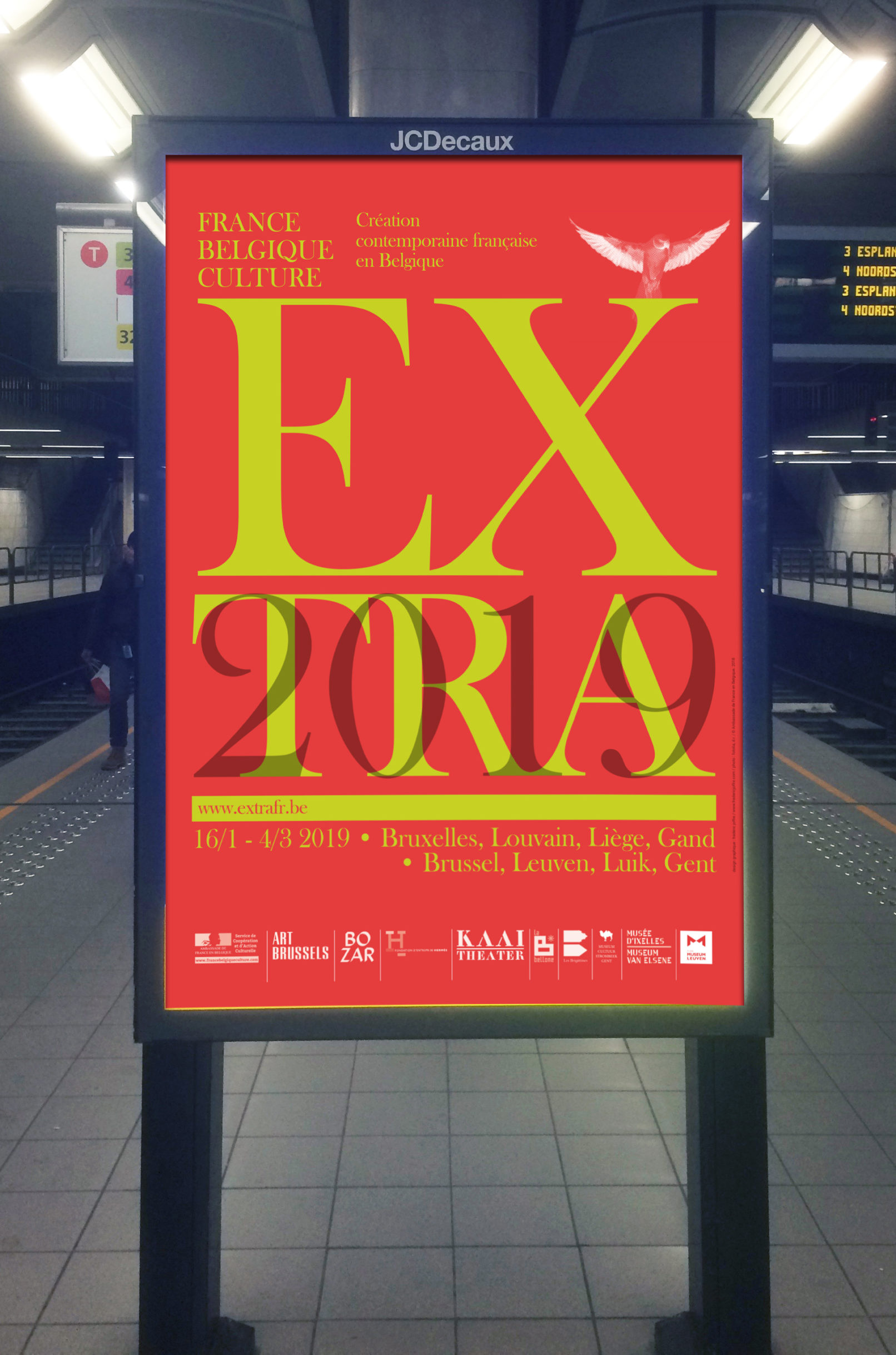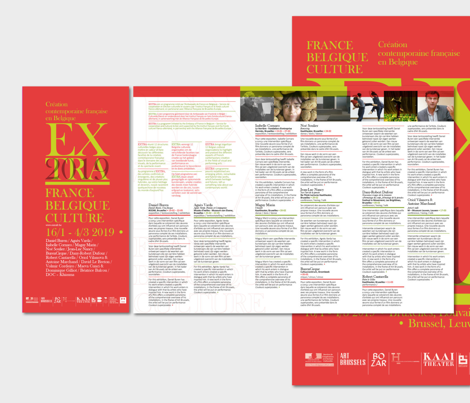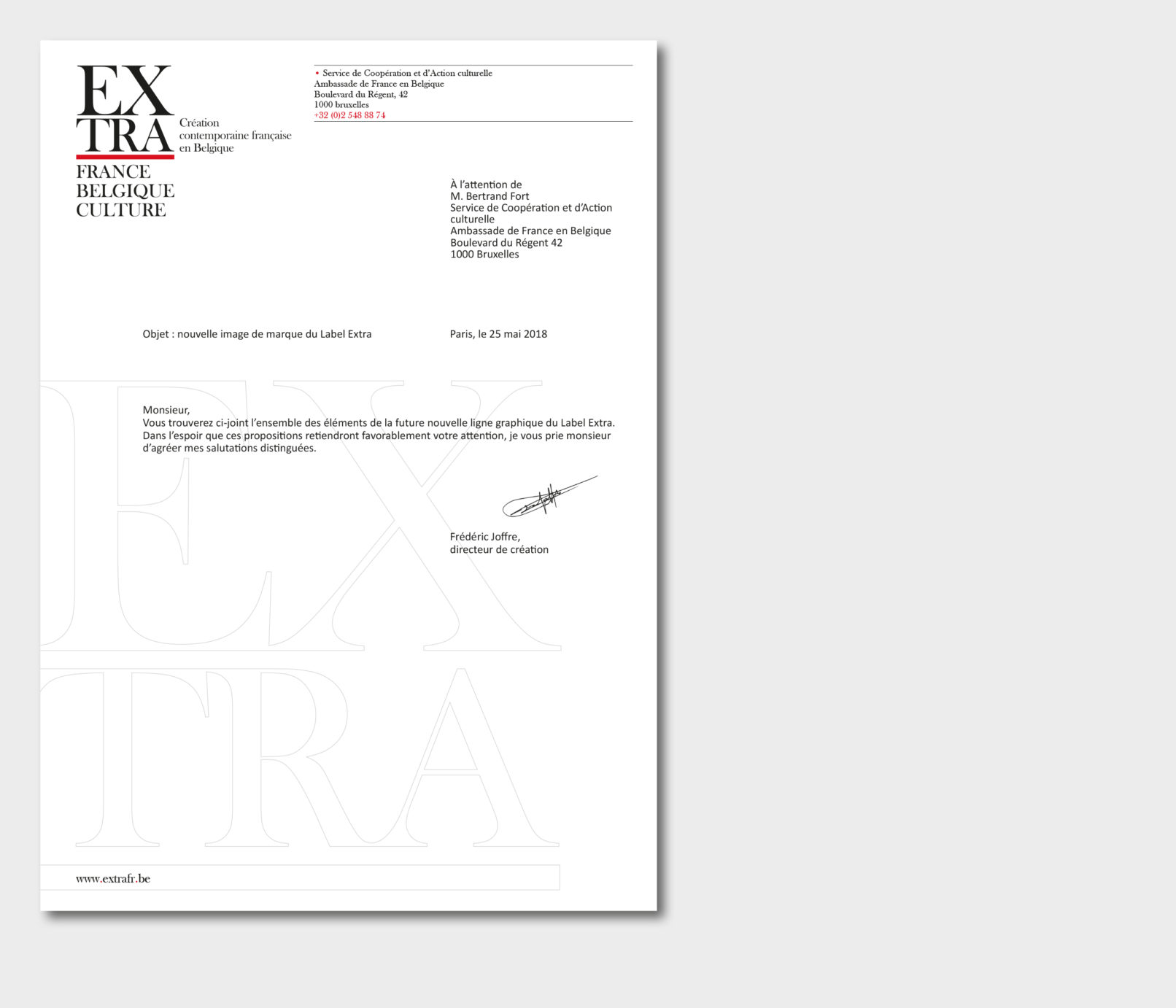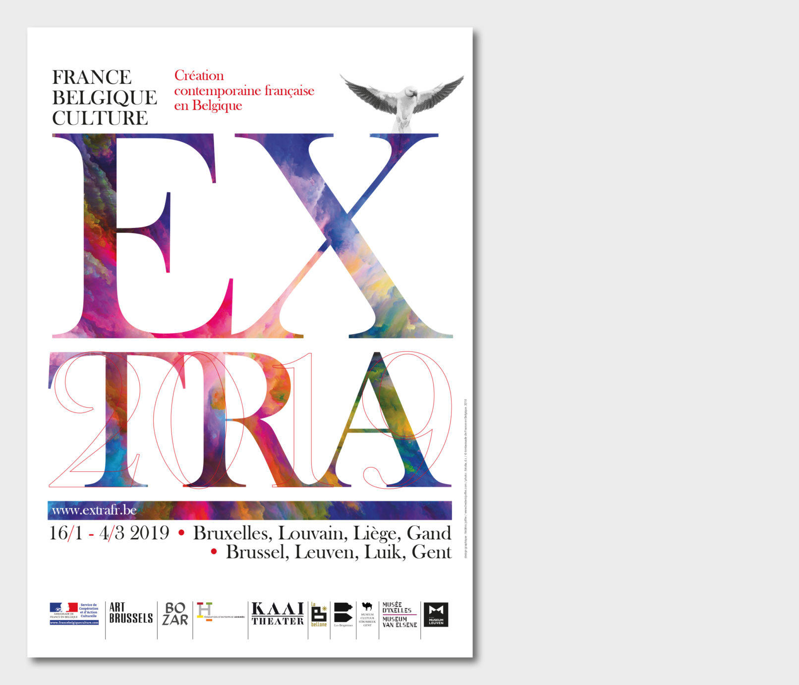 Créé par le service culturel de l’Ambassade de France en Belgique le label Extra réunit 12 structures culturelles belges pour mettre en valeur et faire découvrir les différentes facettes de la création contemporaine française dans le domaine des arts visuels, de la performance et du spectacle vivant. Sollicité par le service culturel pour rafraichir la ligne graphique du label, j’ai opté pour la création d’un logotype volontairement typographié, dans la mesure où la diversité des artistes, des disciplines (danse, architecture, concerts, conférence, théâtre, performance…) interdit, de mon point de vue, l’utilisation d’une image en particulier. Le logotype typographié est décliné sur tous les supports, dans une palette de couleurs vives, volontairement saturées pour donner l’impact nécessaire à cette promotion de la création contemporaine française en Belgique. Projet malheureusement refusé par l’Ambassade de France.