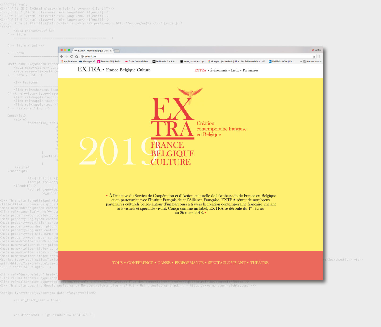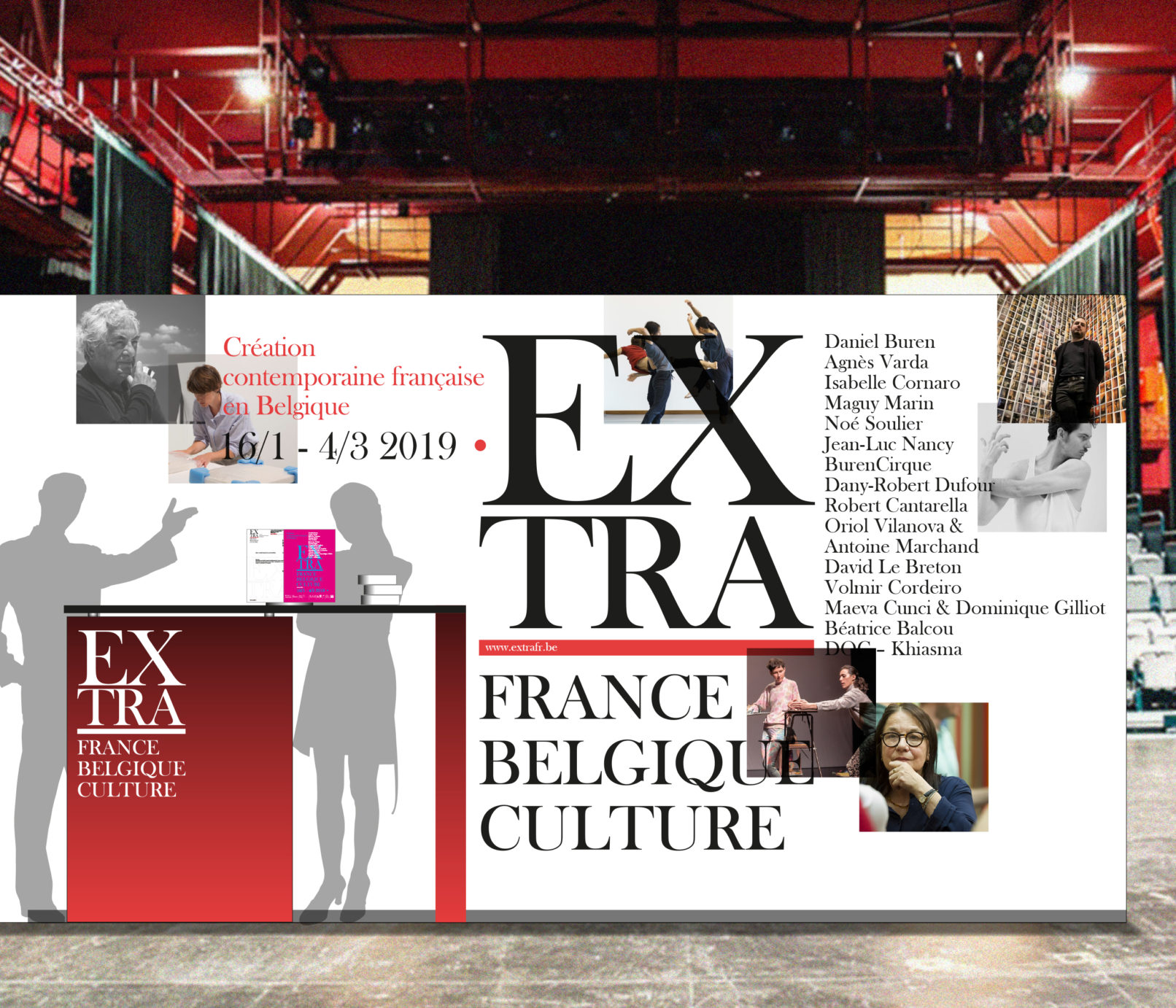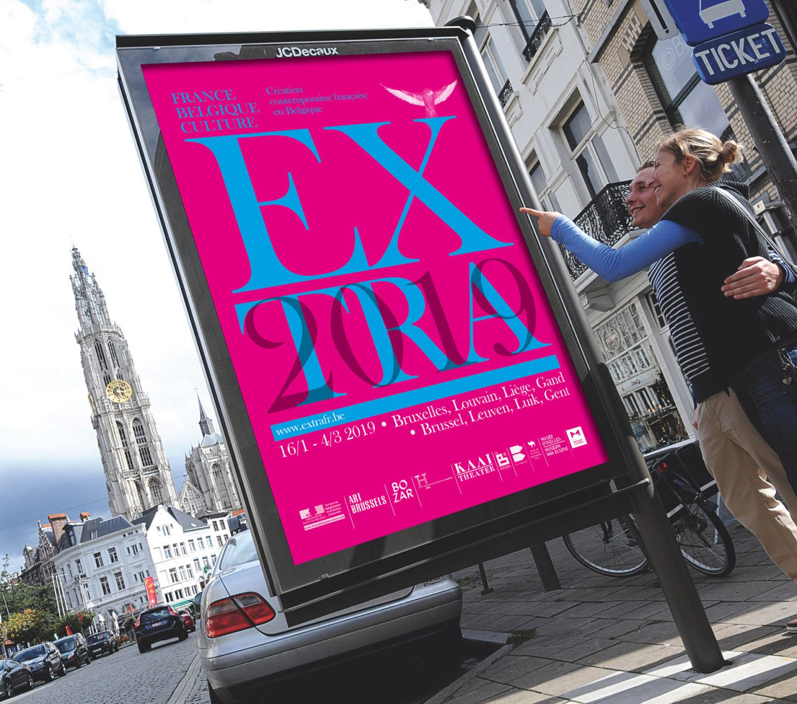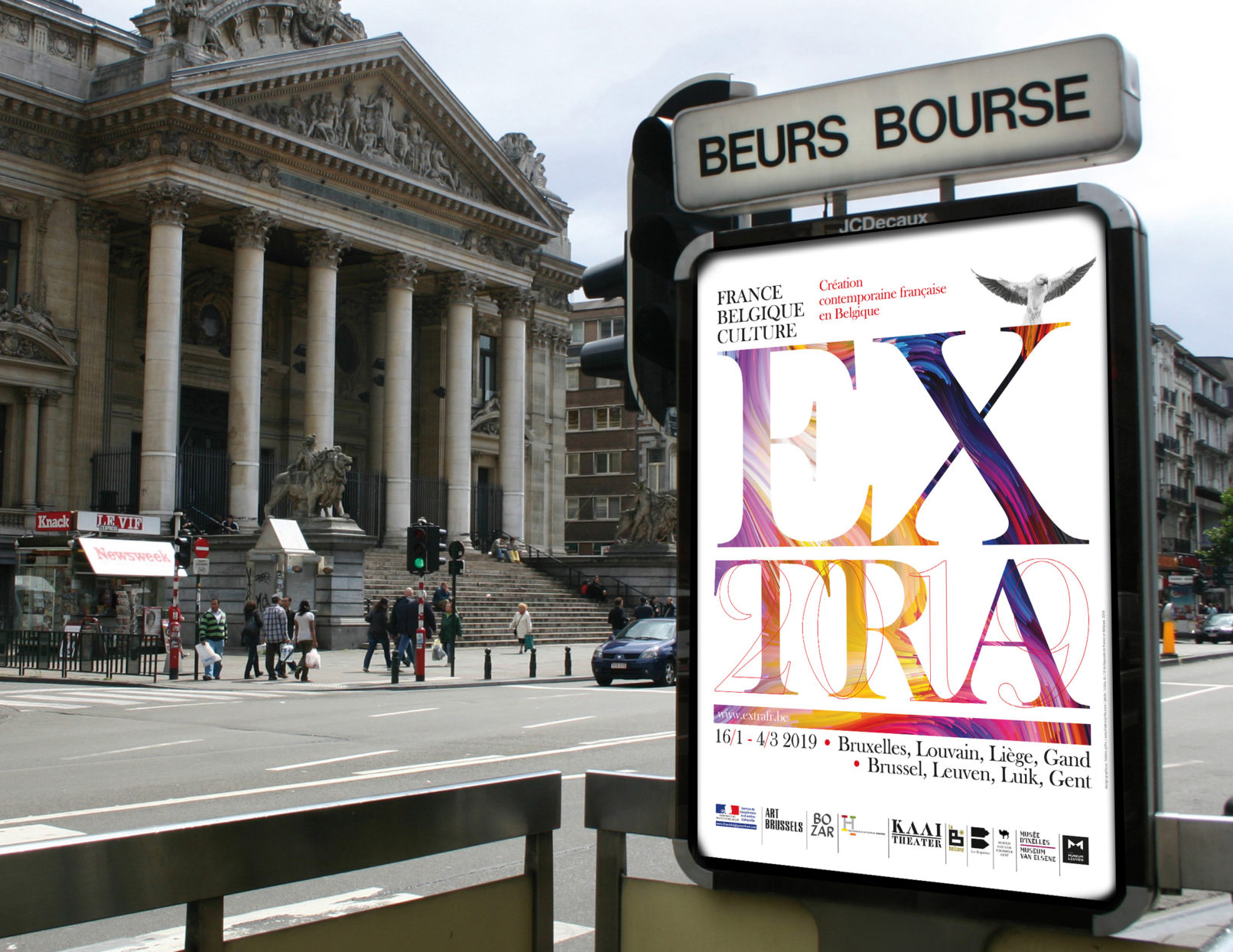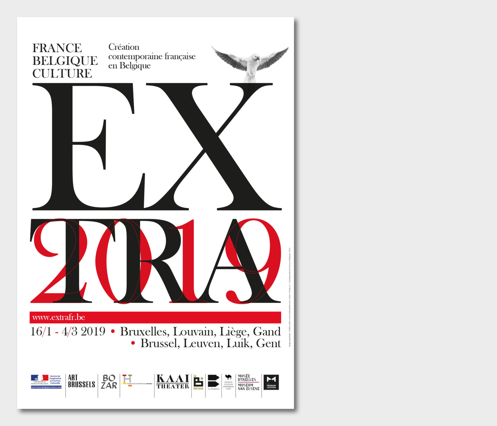 Créé par le service culturel de l’Ambassade de France en Belgique le label Extra réunit 12 structures culturelles belges pour mettre en valeur et faire découvrir les différentes facettes de la création contemporaine française dans le domaine des arts visuels, de la performance et du spectacle vivant. Sollicité par le service culturel pour rafraichir la ligne graphique du label, j’ai opté pour la création d’un logotype volontairement typographié, dans la mesure où la diversité des artistes, des disciplines (danse, architecture, concerts, conférence, théâtre, performance…) interdit, de mon point de vue, l’utilisation d’une image en particulier. Le logotype typographié est décliné sur tous les supports, dans une palette de couleurs vives, volontairement saturées pour donner l’impact nécessaire à cette promotion de la création contemporaine française en Belgique. Projet malheureusement refusé par l’Ambassade de France.