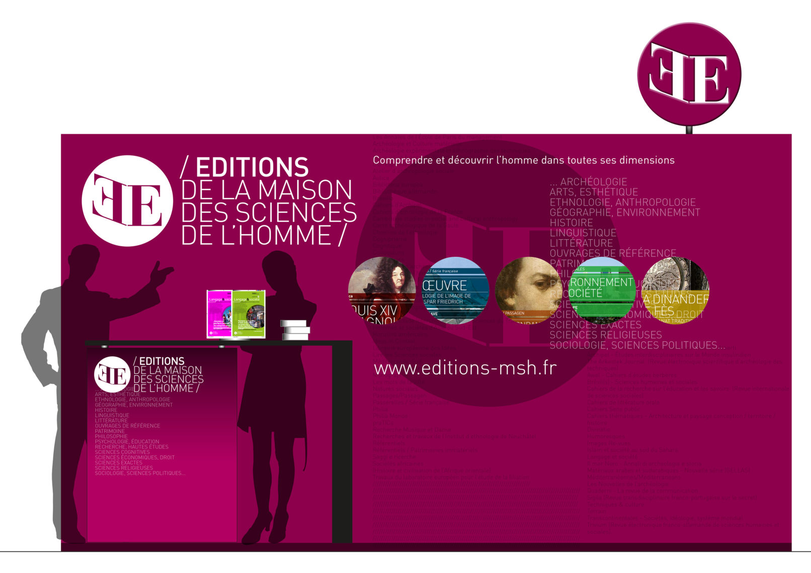 Les éditions de la Maison des sciences de l’homme publient de nombreux ouvrages, collections, revues spécialisées en sciences humaines (linguistique, sociologie, histoire, géo-politique, histoire de l’art, ethnologie, etc.). L’ensemble de ses publications se télescopent dans un joyeuse anarchie visuelle sans que l’on puisse clairement identifier l’émetteur ou même attribuer les collections et revues à cet émetteur. J’ai été sollicité pour donner une cohérence et une homogénéité aux publications de l’EMSH. La direction n’a pas donné suite… et les publications sont toujours aussi… hétérogènes.