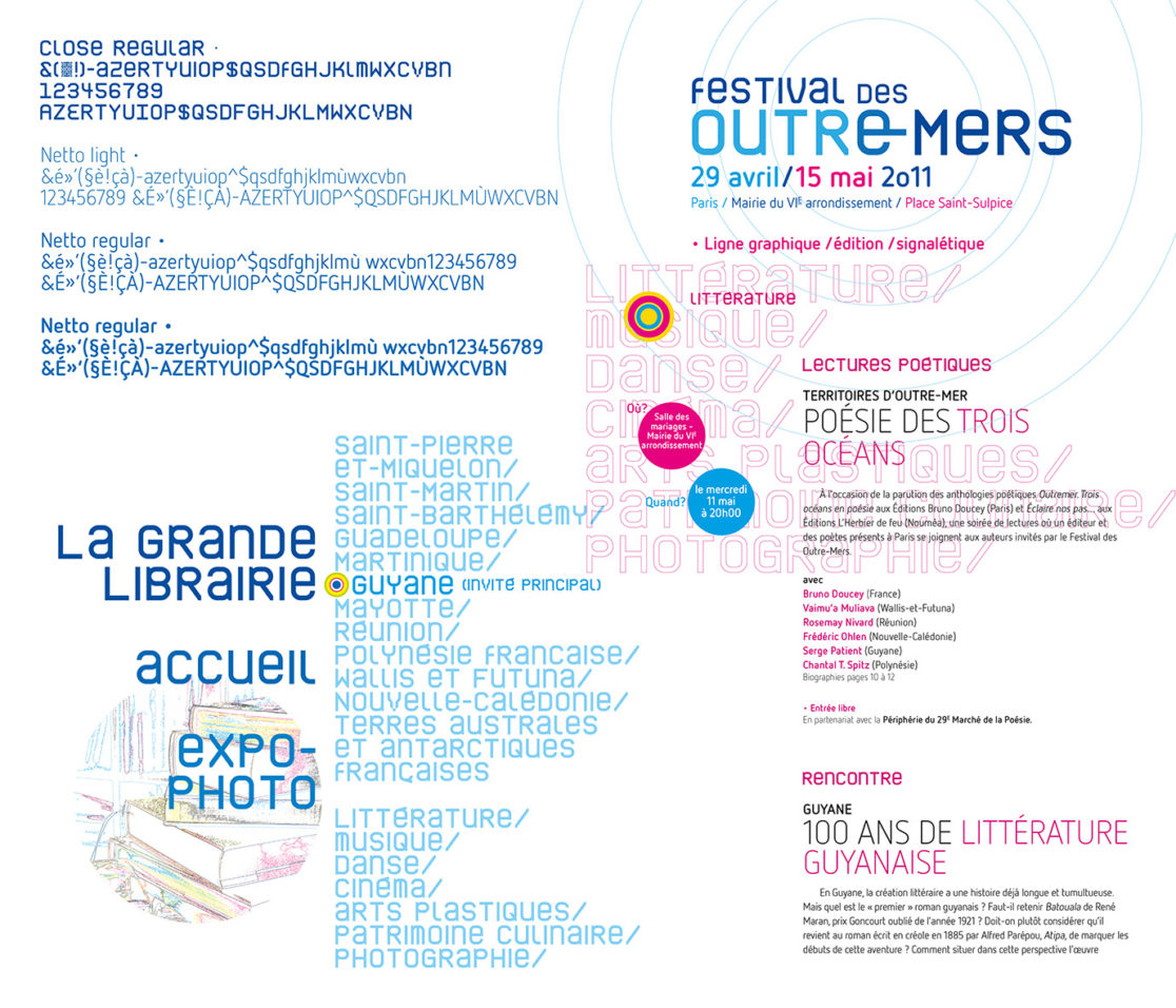 Le festival des Outre-mers propose chaque année de présenter les spécificités et particularités culturelles des territoires ultra-marins en proposant conférences, expositions, films sur la littérature, le cinéma, les arts plastiques… et propose de considérer ces territoires ultramarins (Caraïbes, Pacifique, Amérique du Sud…) non pas comme des destinations mais comme des points de départ. Les responsables exigeaient une ligne graphique résolument abstraite sans aucune référence figurative à l’univers stéréotypé de ces territoires lointains.