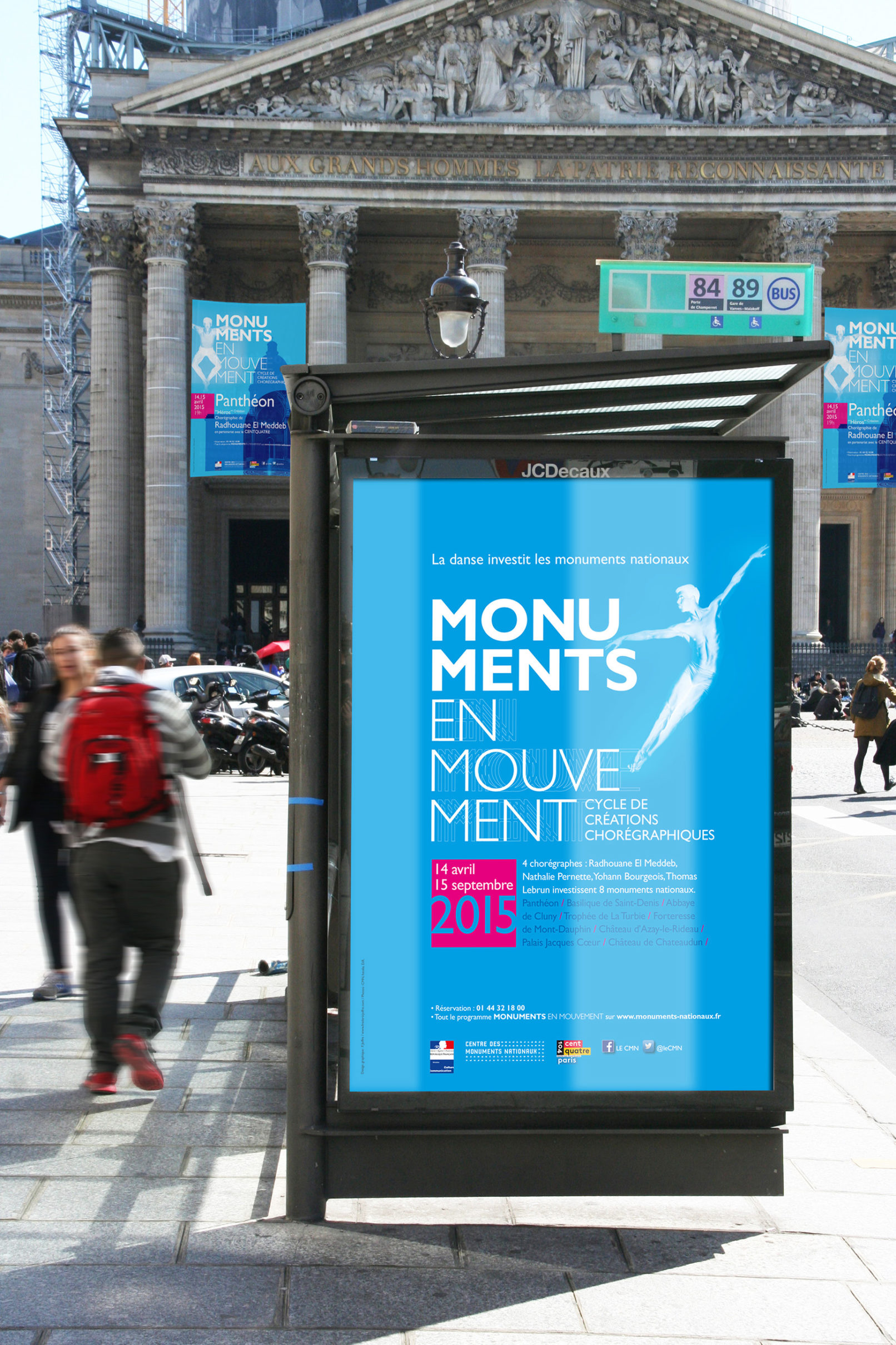 Le Centre des monuments nationaux a lancé un appel d’offres en 2015 pour concevoir la promotion d’événements chorégraphiques pour le moins originaux, puisque devant se tenir dans les espaces de monuments nationaux (Panthéon, cathédrale de Saint-Denis, etc.). Le cahier des charges exigeait une ligne graphique colorée, « d’jeune », dynamique, fraîche… Le CNM a opté en définitive pour une création peu colorée, moyennement jeune… et pas vraiment dynamique.