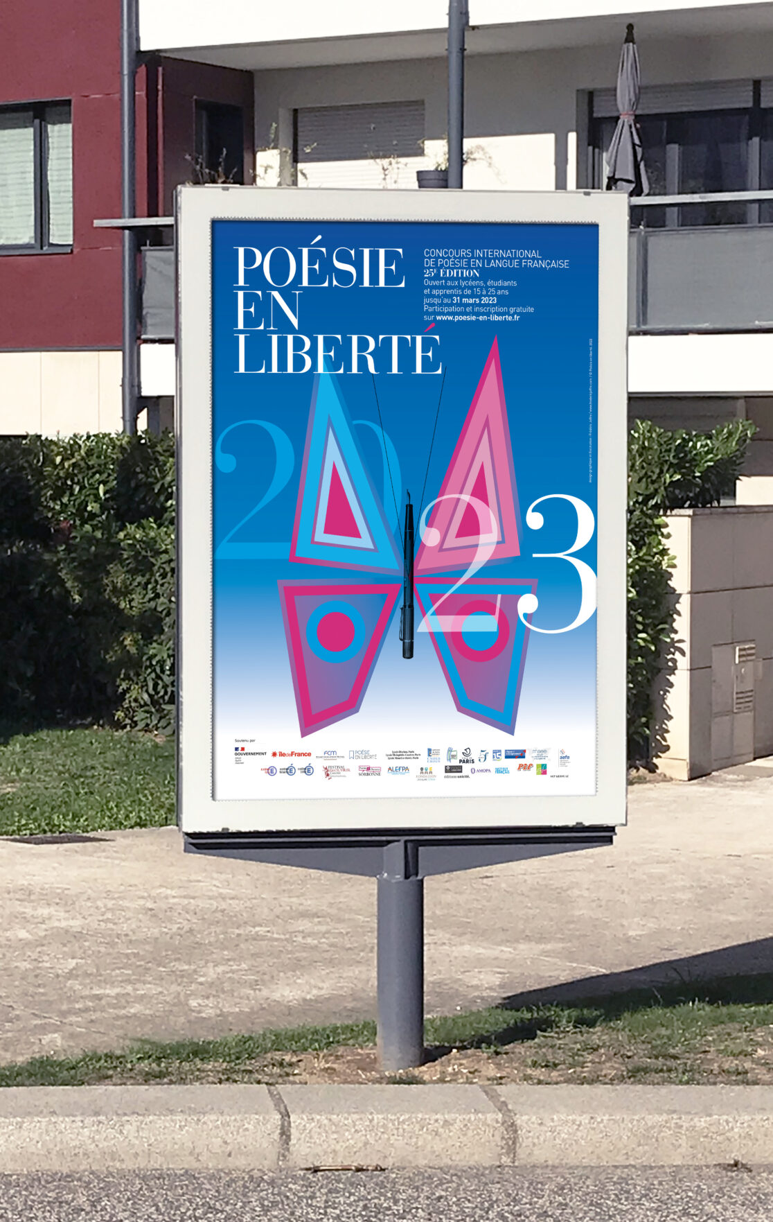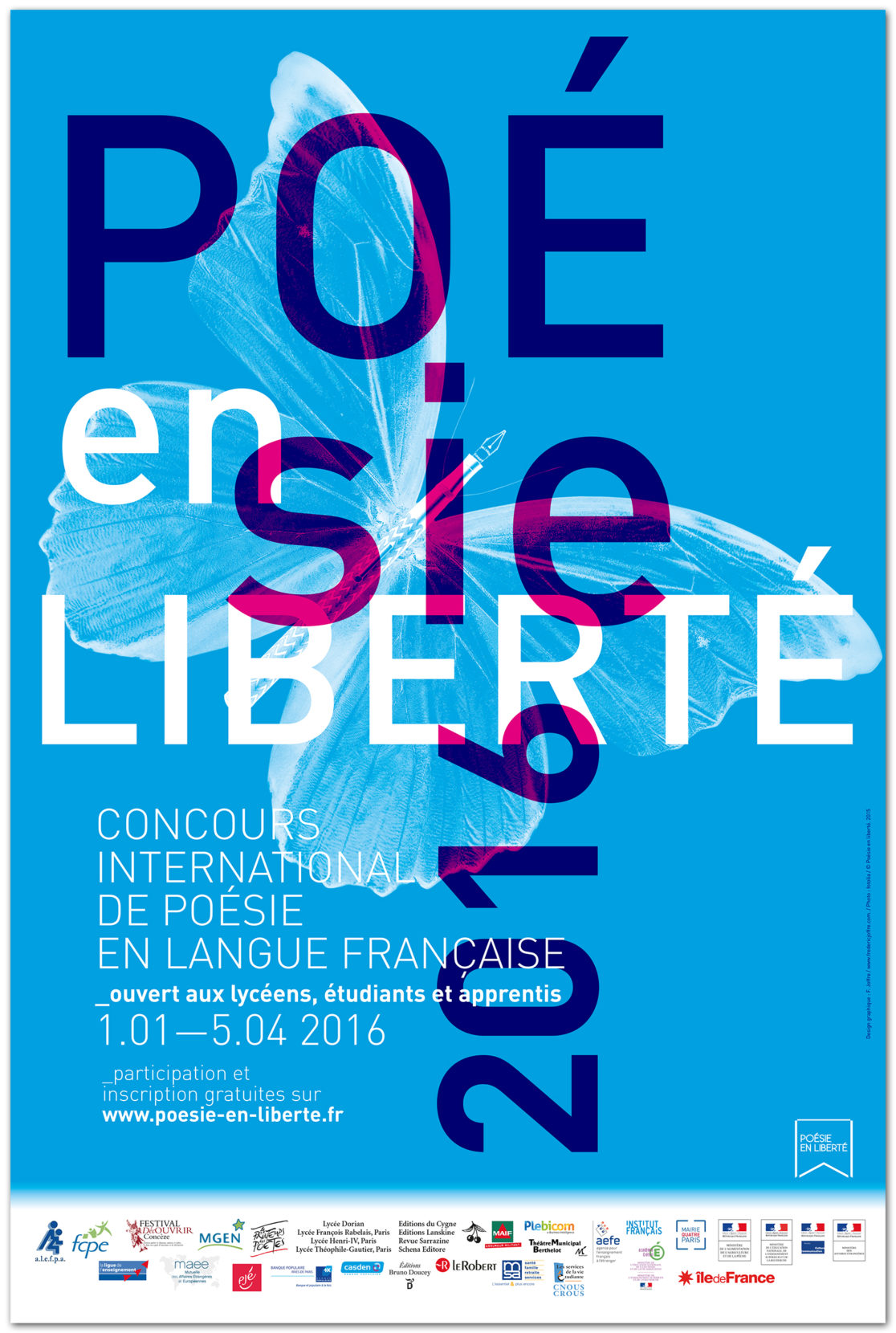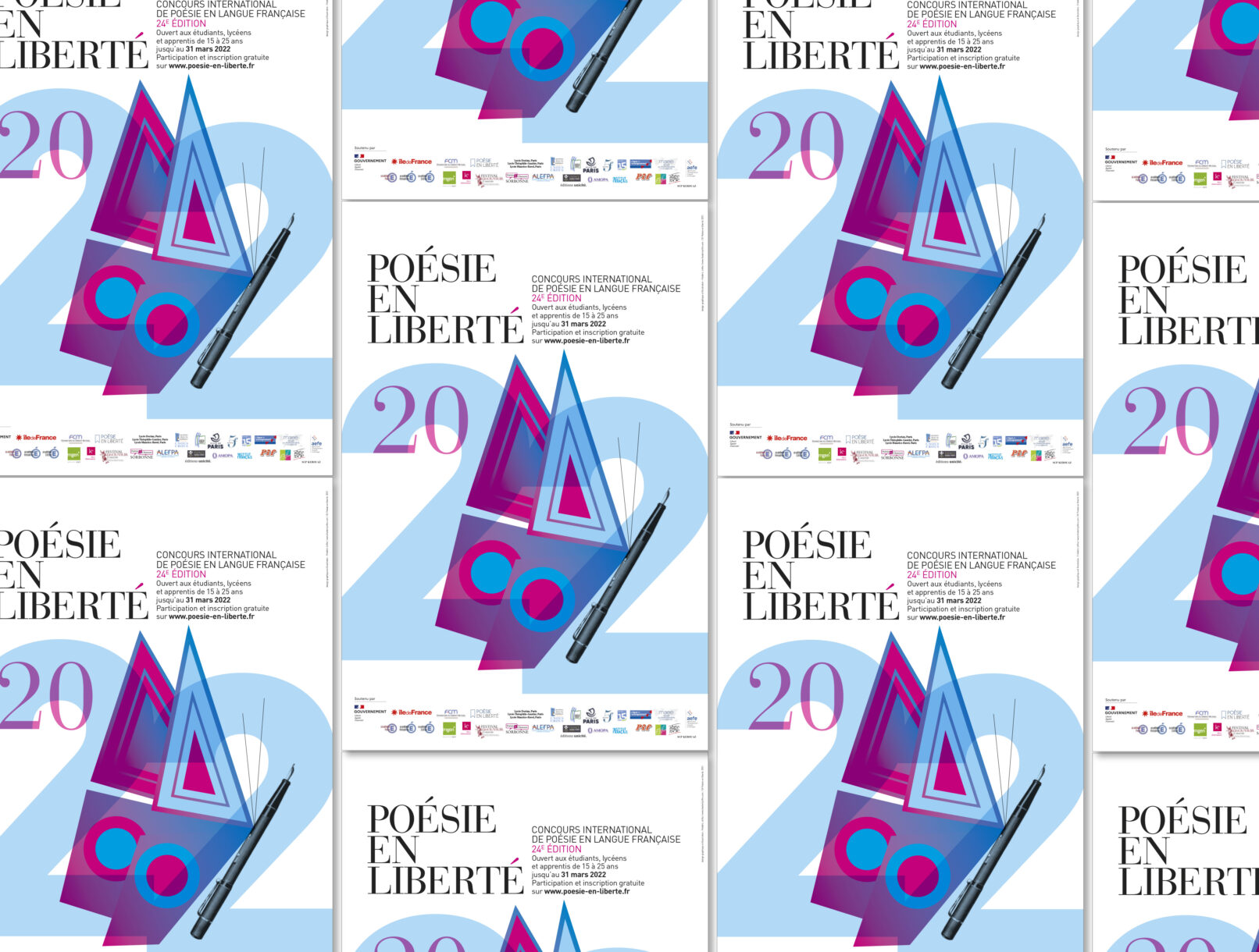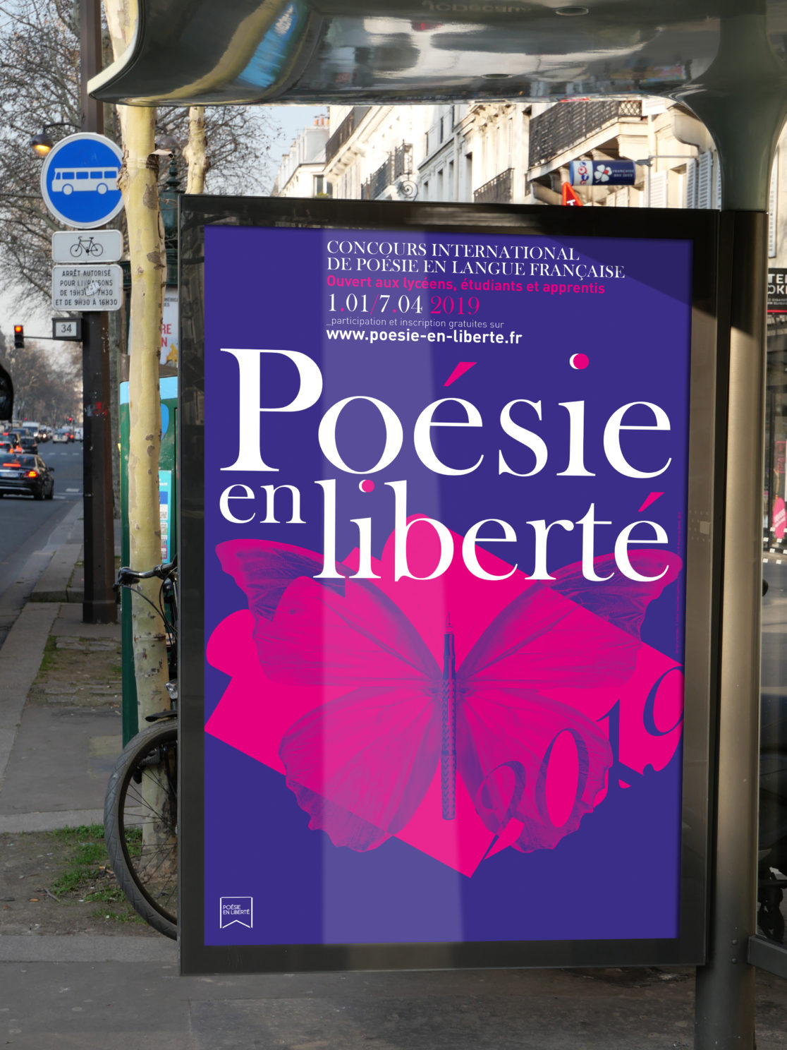 Poésie en liberté est un concours de poésie en langue française ouvert à tous les éléves de collèges, lycées et étudiants d’universités. Ce concours s’adresse à tous les établissements scolaires et universitaires de France, de même qu’aux établissements français de l’étranger. J’ai initialement conçu une identité visuelle colorée (utilisant uniquement deux couleurs primaires : cyan et magenta) dans une ligne graphique très épurée qui jouait avec l’image des mots que j’ai ensuite fait évoluer (depuis 2016) vers l’utilisation d’une illustration symbolique composée d’un papillon stylo.