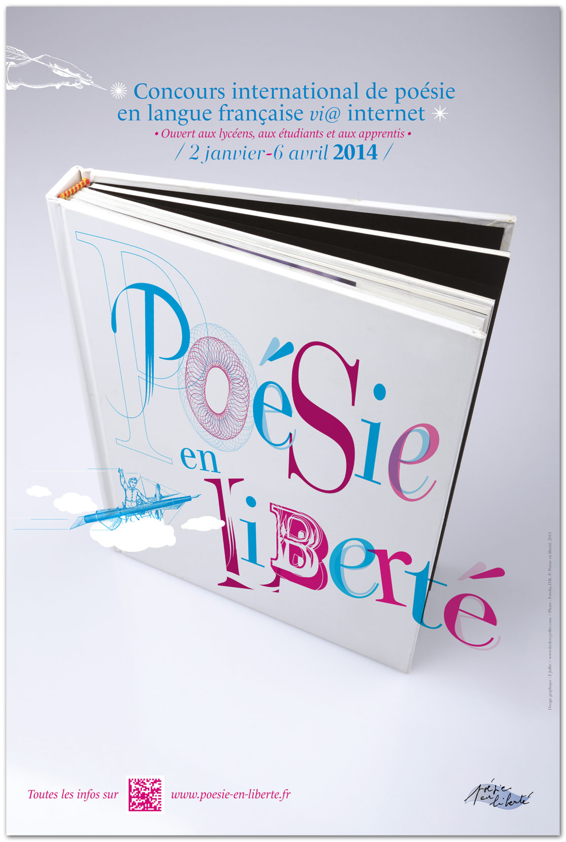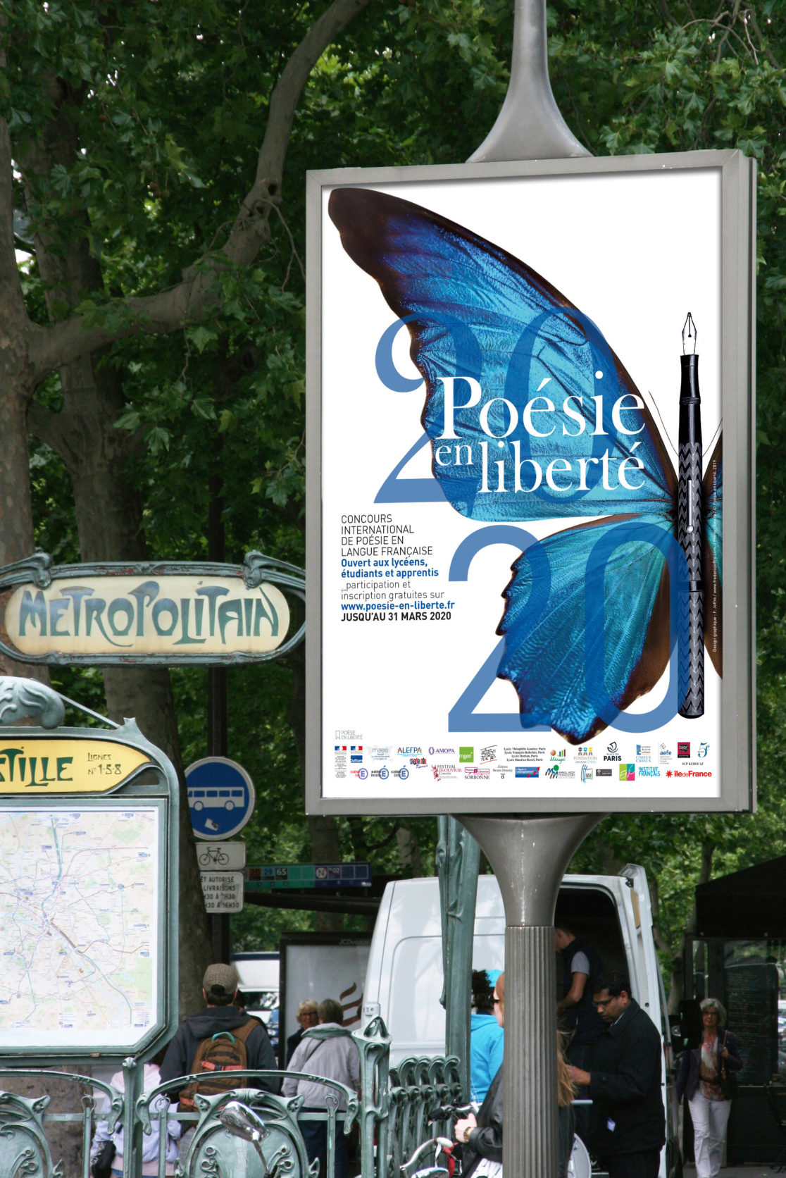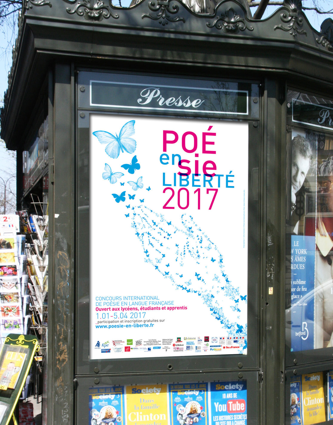 Poésie en liberté est un concours de poésie en langue française ouvert à tous les éléves de collèges, lycées et étudiants d’universités. Ce concours s’adresse à tous les établissements scolaires et universitaires de France, de même qu’aux établissements français de l’étranger. J’ai initialement conçu une identité visuelle colorée (utilisant uniquement deux couleurs primaires : cyan et magenta) dans une ligne graphique très épurée qui jouait avec l’image des mots que j’ai ensuite fait évoluer (depuis 2016) vers l’utilisation d’une illustration symbolique composée d’un papillon stylo.