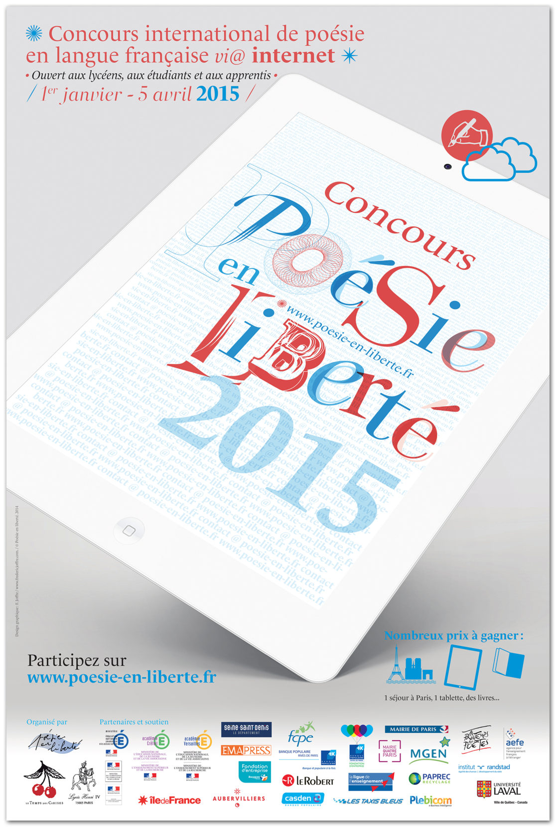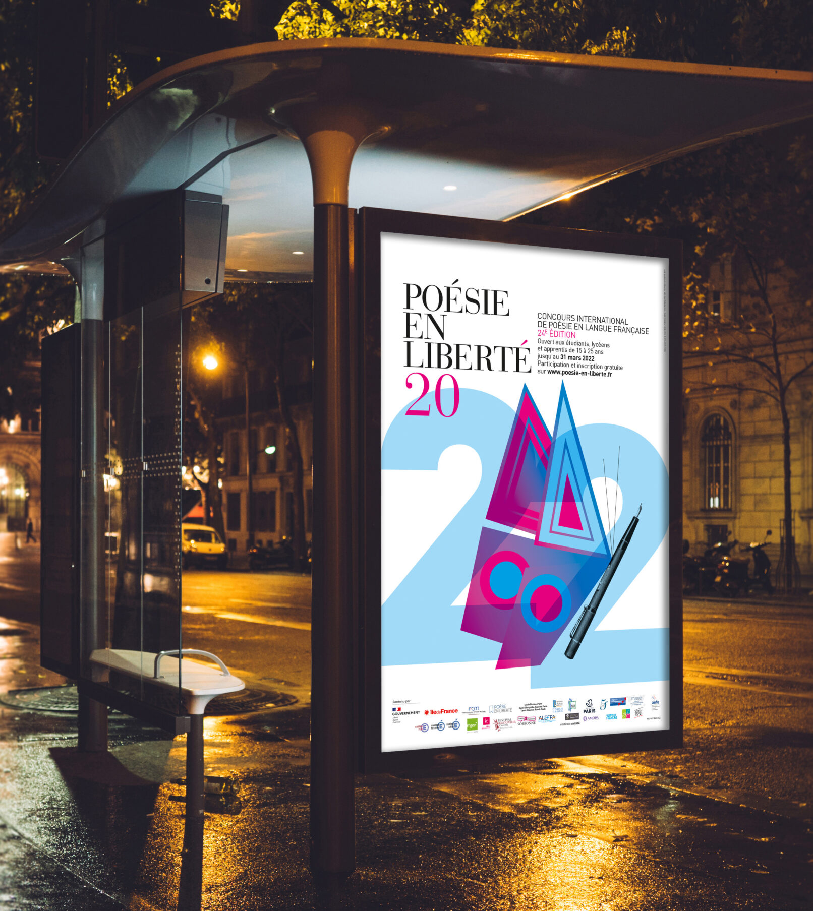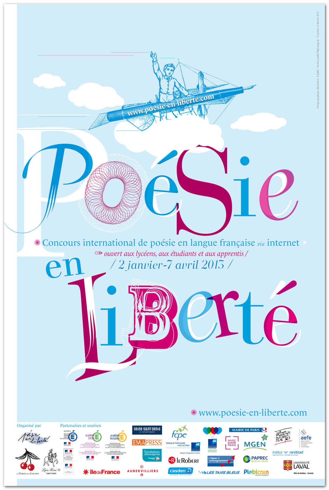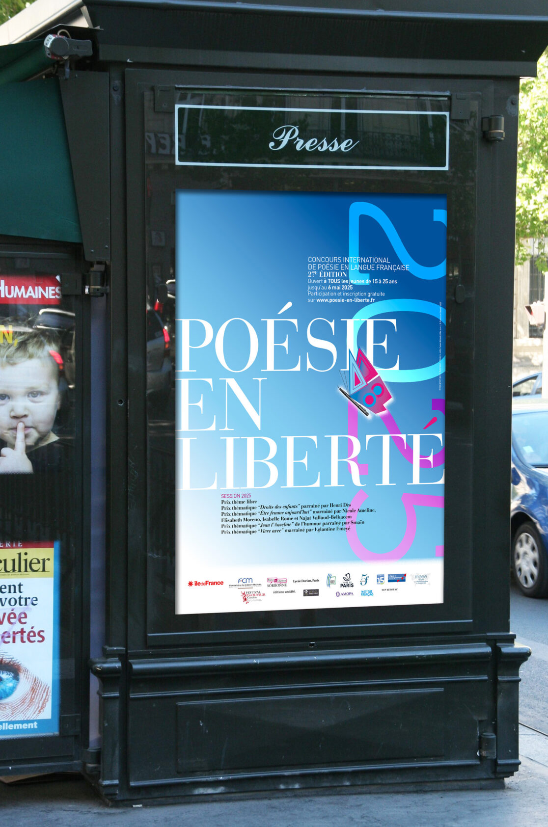 Poésie en liberté est un concours de poésie en langue française ouvert à tous les éléves de collèges, lycées et étudiants d’universités. Ce concours s’adresse à tous les établissements scolaires et universitaires de France, de même qu’aux établissements français de l’étranger. J’ai initialement conçu une identité visuelle colorée (utilisant uniquement deux couleurs primaires : cyan et magenta) dans une ligne graphique très épurée qui jouait avec l’image des mots que j’ai ensuite fait évoluer (depuis 2016) vers l’utilisation d’une illustration symbolique composée d’un papillon stylo.