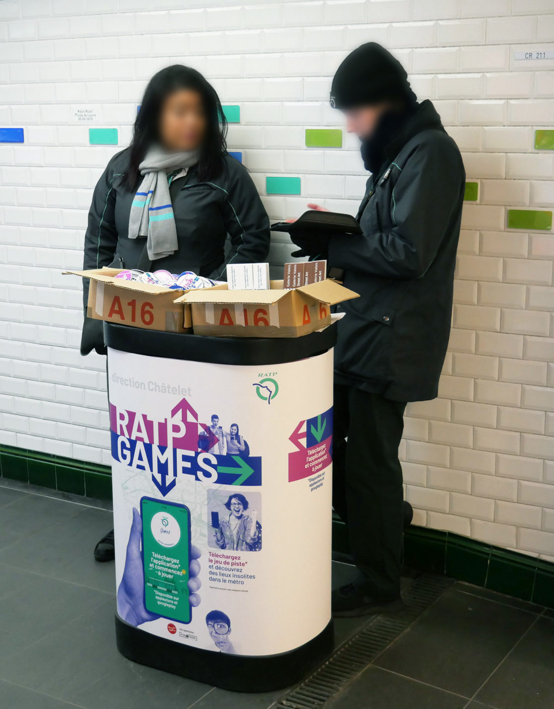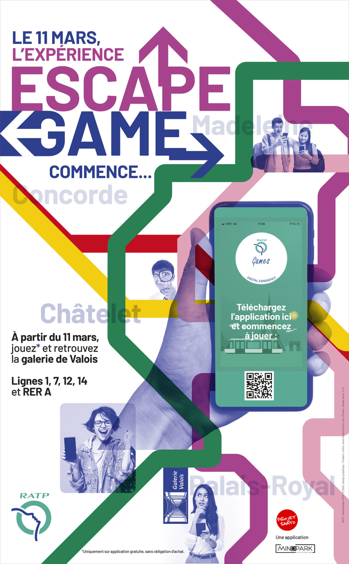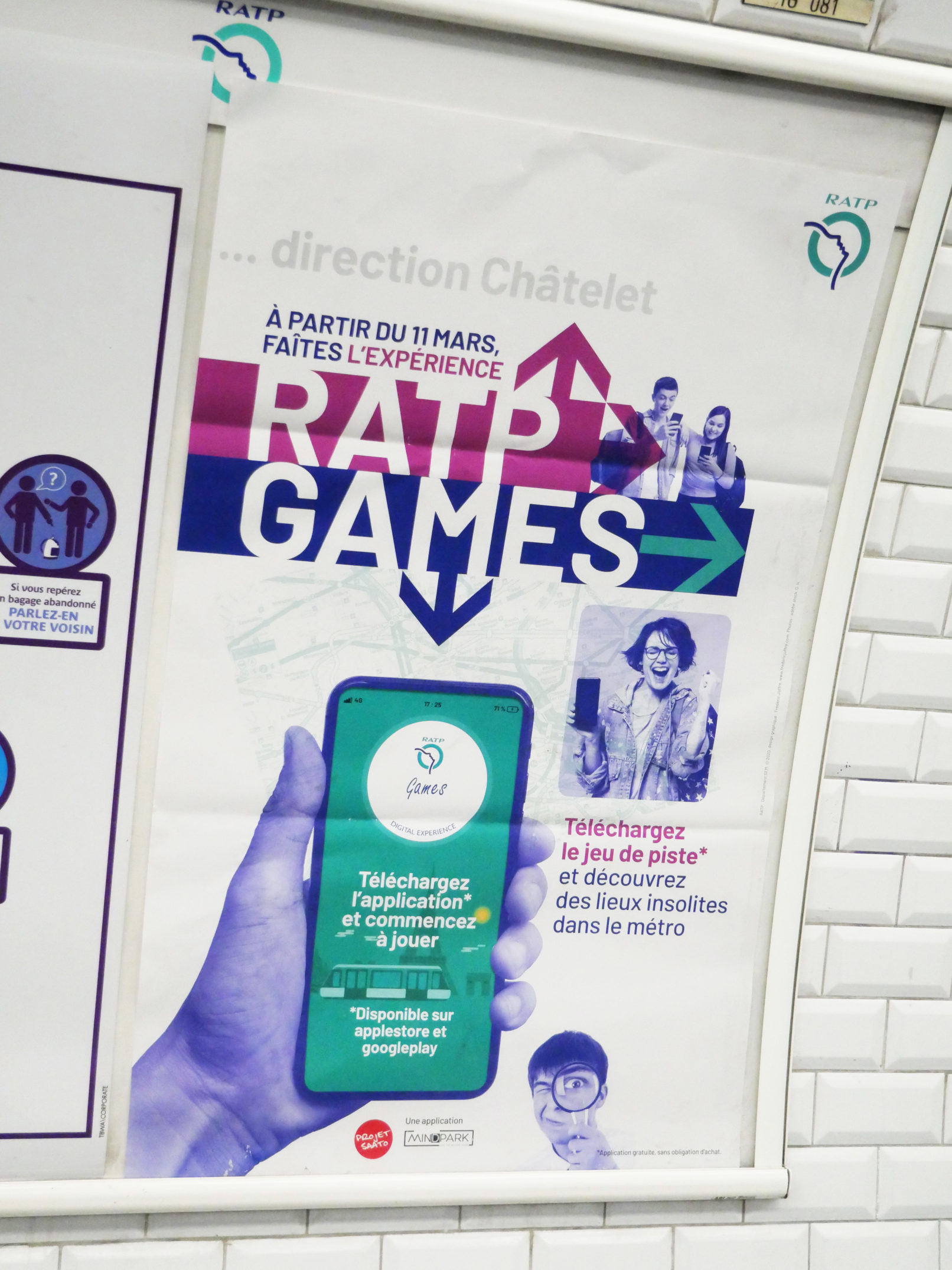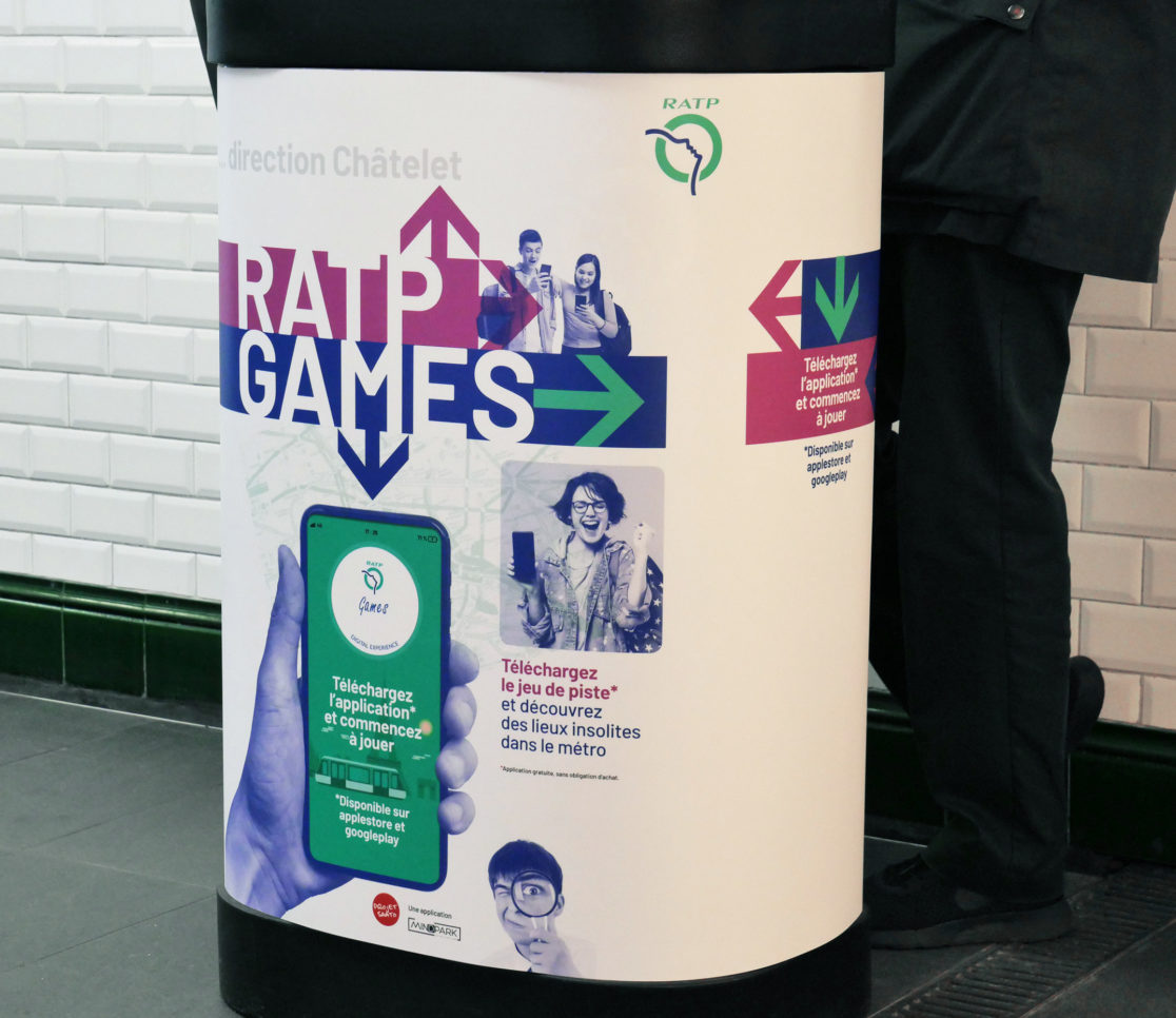 La RATP a lancé au début du mois de mars 2020, une application “escape game” dans les espaces du métro de Paris. La campagne d’affichage a été diffusée dans les 368 stations du réseau. Le jeu conduit, après une série de petites énigmes, à la galerie Valois (Palais-Royal) où sont exposées des œuvres d’artistes du street Art installées dans les anciennes vitrines de cette galerie. Malheureusement, la pandémie a écourté l’opération de communication.