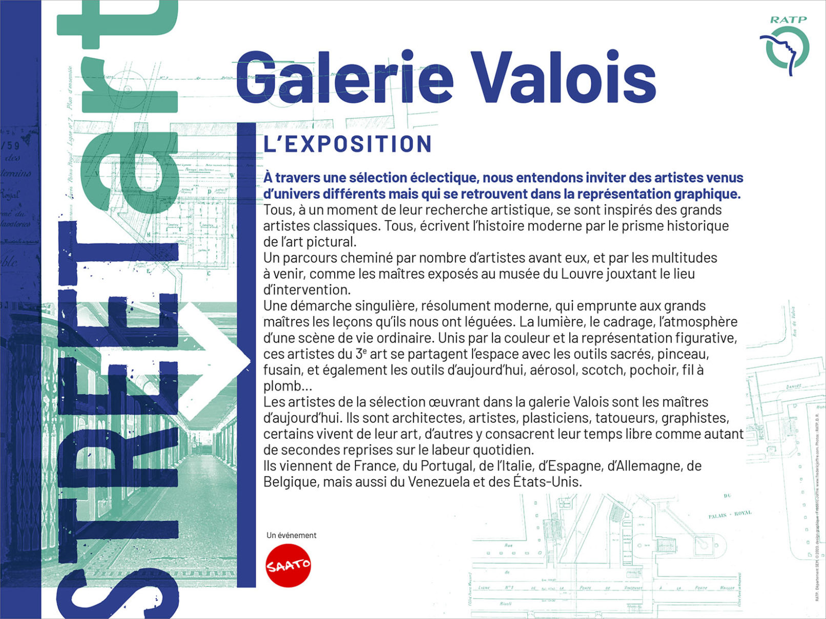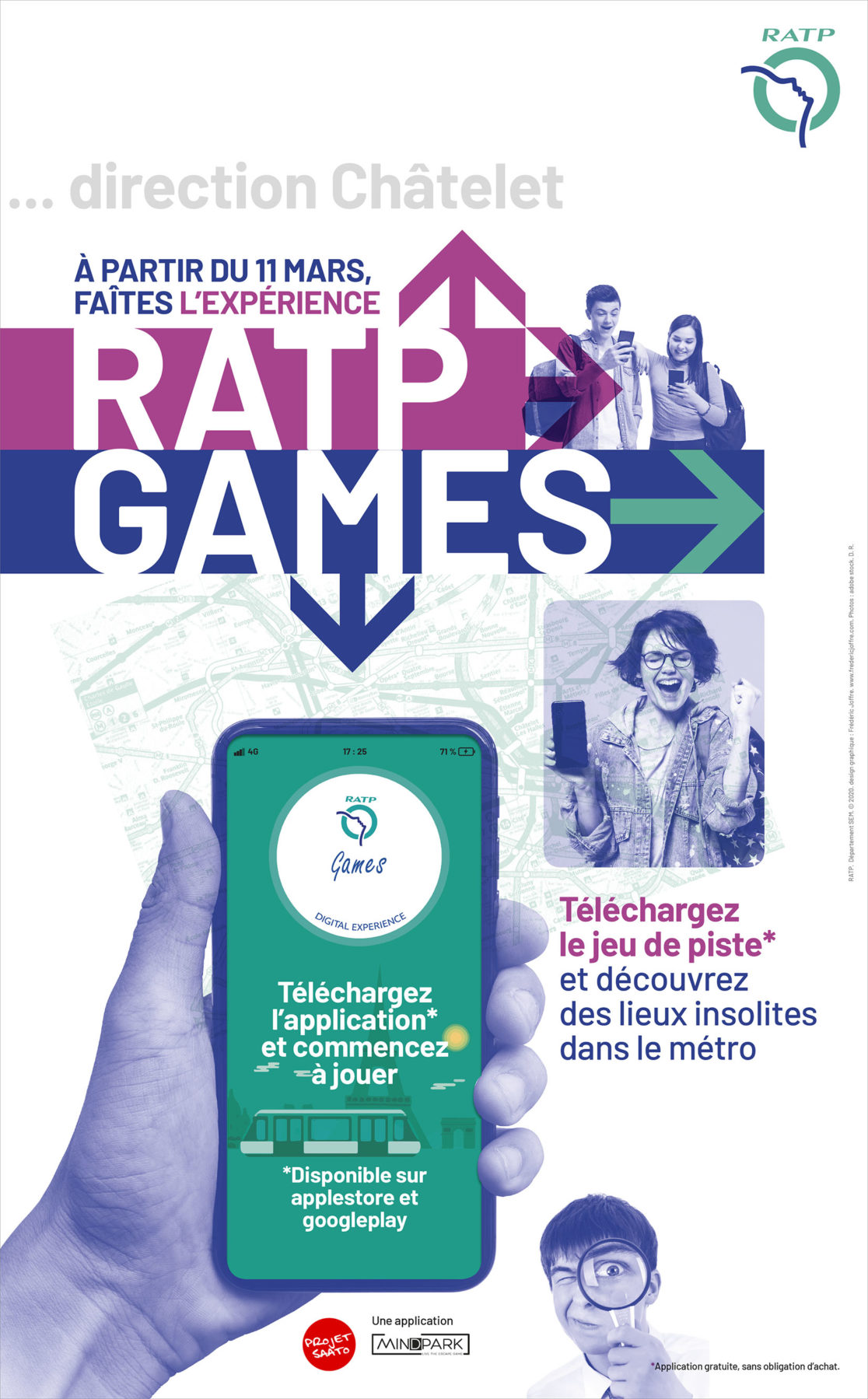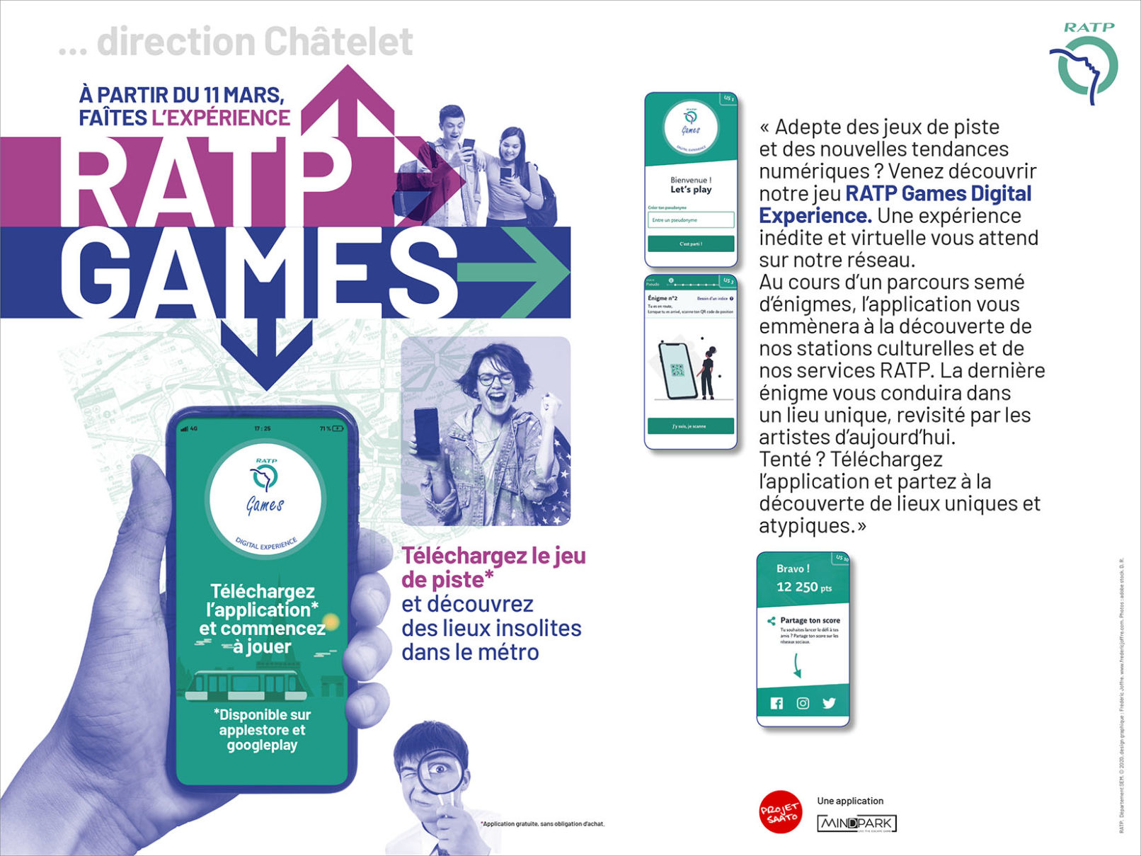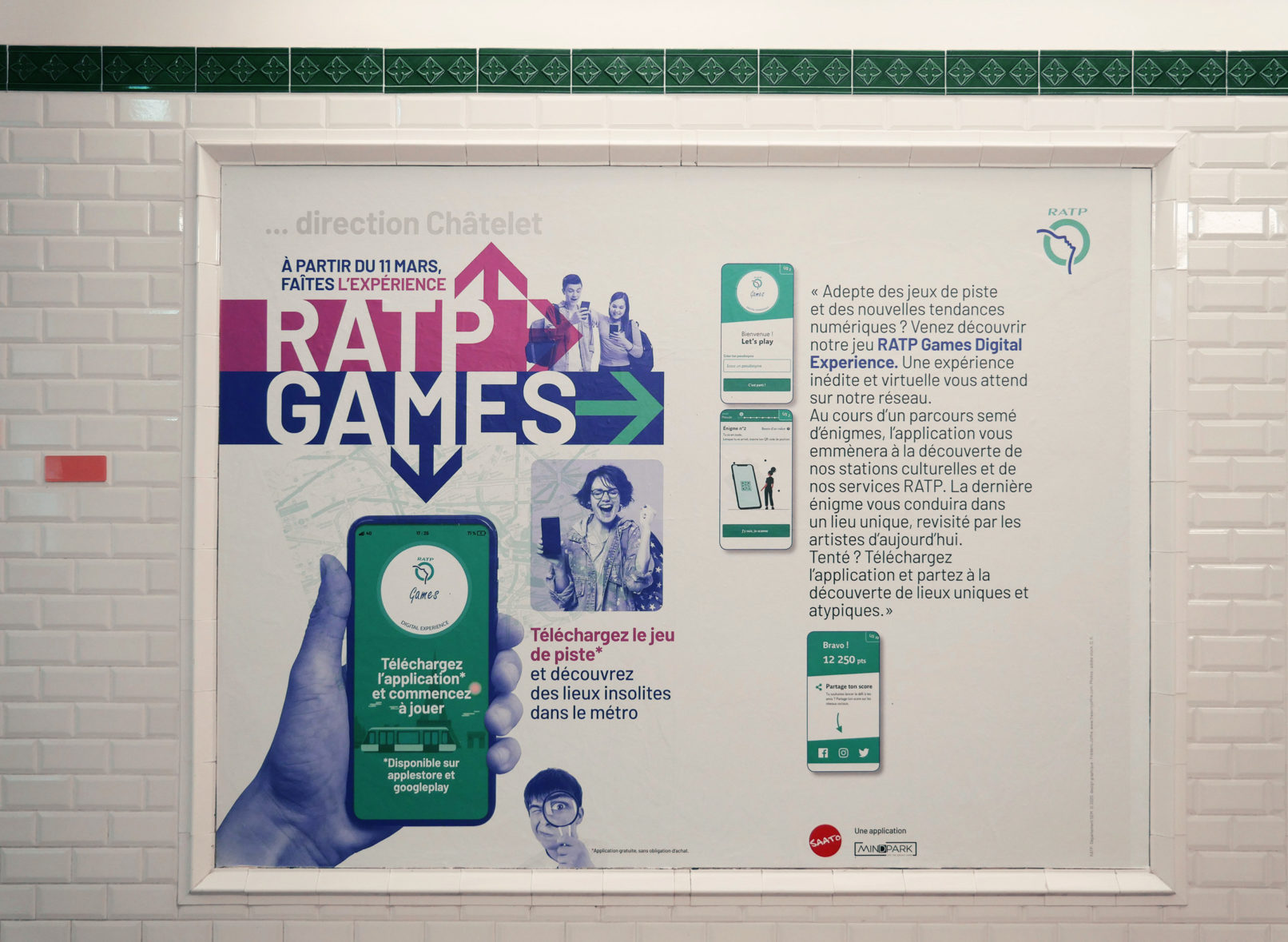 La RATP a lancé au début du mois de mars 2020, une application “escape game” dans les espaces du métro de Paris. La campagne d’affichage a été diffusée dans les 368 stations du réseau. Le jeu conduit, après une série de petites énigmes, à la galerie Valois (Palais-Royal) où sont exposées des œuvres d’artistes du street Art installées dans les anciennes vitrines de cette galerie. Malheureusement, la pandémie a écourté l’opération de communication.